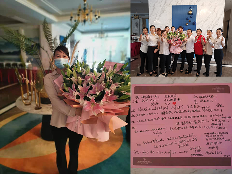 彭庆红是尊时凯龙人生就博餐饮部一位可爱大姐,工作上勤勤恳恳,任劳任怨。今年6月15日是她女儿的婚期,这段时间因酒店工作太忙的都没时间好好地陪她的小公主,直到昨天才向部门领导提出调休申请。部门经理得知后,立即和主管们商量要给彭大姐一份难忘的“惊喜”和送上大大的祝福。于是他们悄悄地定了一大束美丽的鲜花,在今天晨会上献给了彭大姐,鲜花上的便签填满了餐饮部所有同事的祝福。这对于彭大姐来说不仅是祝福和惊喜,更是一份美好的回忆!