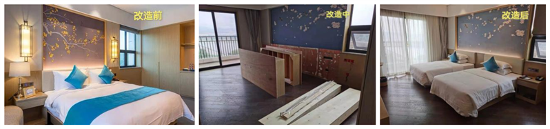 随着旅游业的发展,辉隆君澜度假酒店位于全国首批全域旅游示范区-霍山,原本44间标准间无法满足旅游及会议市场的需求,时常出现大型团队客房无法入住,从而使酒店流失大量客人,为了扭转被动局面,经酒店管理领导小组几番会议讨论,并根据2020年度酒店的客源分析和周边同行的市场论证,最终决定利用疫情空档期于8月中旬动工,对酒店客房进行改造,将原本的19间单间改为标间、19间单间改为子母房,使标准间增加至82间,床位从原本的216张增加至254张。