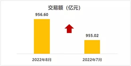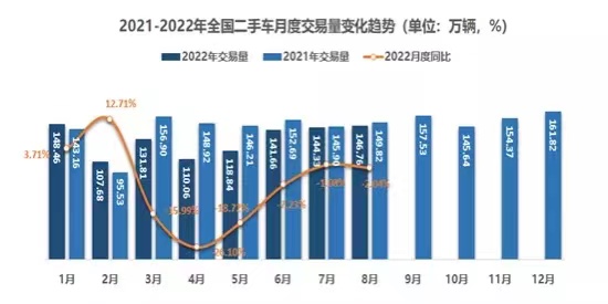 2022年8月,全国二手车市场交易量146.76万辆,交易量环比增长1.69%,同比下降2.04%,交易金额为956.6亿元。